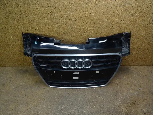 Front bumper grill compatible with AUDI TT 8J from 2006 to 2014, OEM part number: 8J0853651. This is a used original part with visible damage as shown in the pictures. The images reflect the actual condition of the item.