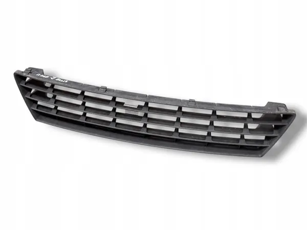 Used center grille for Volkswagen Golf V Plus, OEM 5M0853677D9B9. The part is in visible condition, and the clips are functional. It is a genuine part from Volkswagen, marked with the manufacturer's logo. The grille is black and suitable for passenger cars. European version.