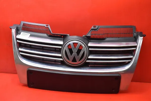 Chrome grill for VW Golf 5, model years 2003-2009. The part is used and has some damage including chips and a broken mounting. OEM number is 1K5853653C. All photos show the actual condition of the item. Parts are sourced legally and stored in dry warehouses to avoid adverse weather conditions.