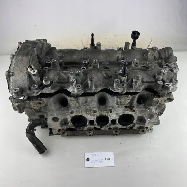 Complete left engine head (without oil filler) for Mercedes C 43 AMG. OEM numbers include R2760162300 and A2760162700. This engine head is compatible with various models including C 400, E 400, GLC 43 AMG, and more, covering production years from 2014 to 2022. The engine code is 276.823, and it features a 3.0L V6 biturbo engine. The part is in excellent condition as shown in the photos. Other alternative part numbers include A2760105309 and A2760102413.