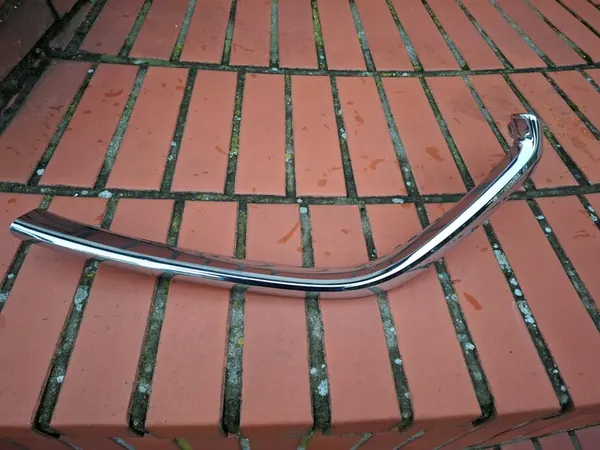 Used original front bumper chrome trim for Mazda 3 (BM) model 2017-2019 after facelift. This is the left trim (driver's side). The trim has a crack in the chrome at the bottom, as shown in images 5, 6, and 7. It exhibits normal signs of use. The photo displays the offered item.