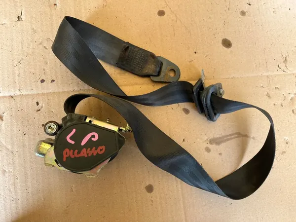 Front left seat belt for Citroen Xsara Picasso, model years 2004-2012. This is an original part from Citroen, in good used condition. The part is suitable for passenger cars and complies with GVO quality standards, marked with the manufacturer's logo (OE). This is the European version of the seat belt. Part number: 6294222.