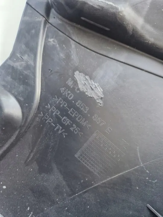 Used front left wheel arch spoiler for Audi A6 C8 4K (2018 onwards). This part is a high-quality replacement comparable to the original. The OEM part number is 4K0853887E. It is suitable for passenger cars and is in good condition.