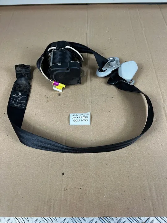 Front right seat belt for VW Golf IV 5-door in black. This used part is an original equipment manufacturer (OEM) component, featuring the vehicle manufacturer's logo. The part number is 1J4857706AA. It is suitable for passenger cars and weighs 2 kg with packaging. Invoice with VAT can be issued.