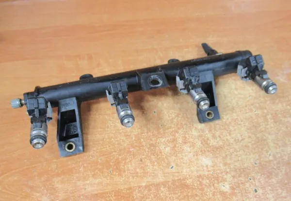 Original fuel injector rail with 4 injectors. Part number: IPM002. Compatible with: Peugeot 206 1.1 8V, Partner; Citroen 1.1 8V, Berlingo, C2, C3. Warehouse number: 6597.