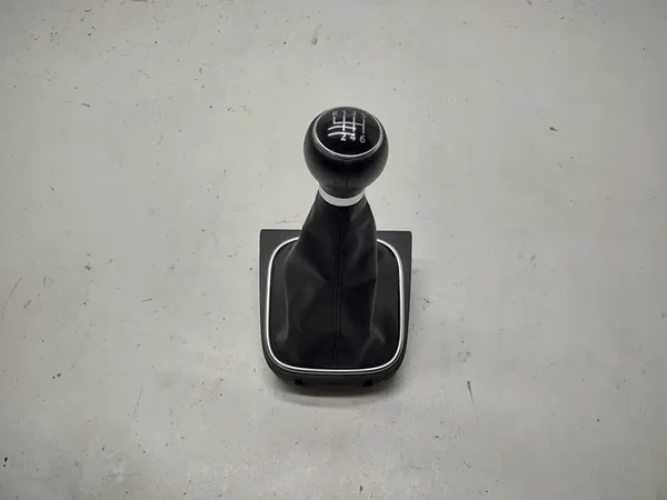 Original leather gear knob with gaiter for a 6-speed transmission, compatible with VW Golf V VI, Jetta, Scirocco, and EOS from 2010. The gear knob shows signs of use. OEM part number: 1K0711113CG.