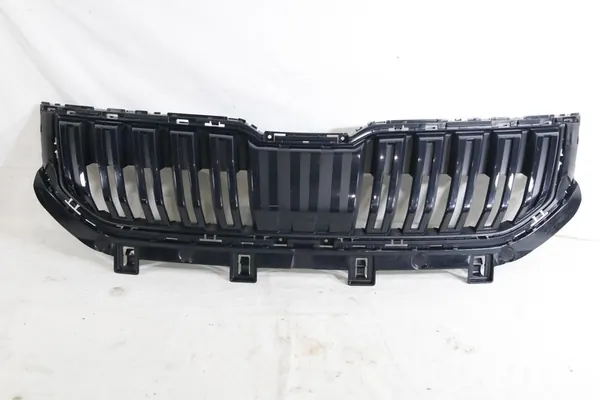 Grill grille for Skoda Karoq 57A, production years 2017 to 2022, pre-facelift. Condition: used original. Description: black glossy plastic, minor scratches, unmodified, original clips intact. Body type: all body types. Car version: all versions. Available side: front upper grill center. Type: mounted clip-on/screwed to the front bumper. OEM: 57a853653b. Color: black plastic as shown in the photo. Quantity: one piece as shown in the gallery.