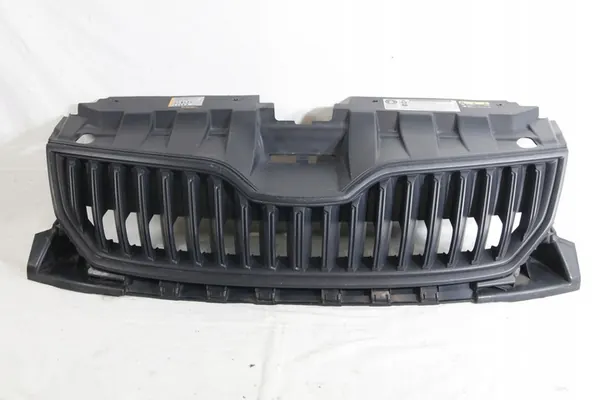 Grill grille for Skoda Fabia III, generation 6v 6v0, produced from 2014 to 2018, pre-facelift. Condition: used original. Description: black plastic integrated with the frame, scratches on the plastic, not repaired, original clips intact (see photo). Body type: all body types. Car version: all versions. Available side: front upper grill center. Type: mounted, clipped/screwed into the front bumper. OEM: 6v0853653a. Color: black plastic - as shown in the photo. Description: used original in the described condition (item condition). Quantity: one piece shown in the gallery. MHMTUNING number: uz16049.