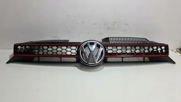 Used original radiator grille for VW Golf VI GTI, European version. Visual condition has a defect marked in the photo. Part number: 5K0853651AK.