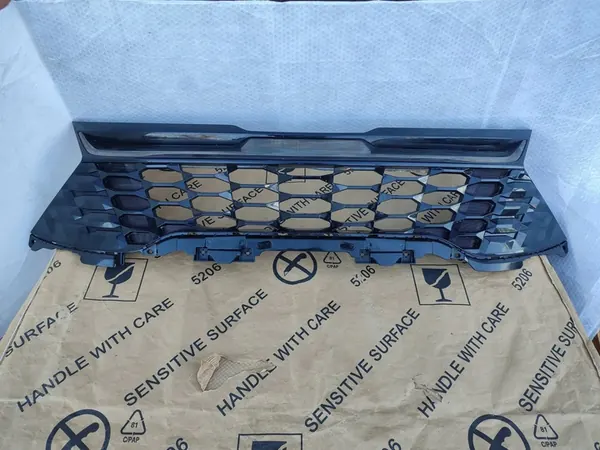 The grill has a crack in one place as shown in the photo. One mounting point is damaged. This version does not include a camera and is in black gloss. The item offered is exactly the grill shown in the pictures.