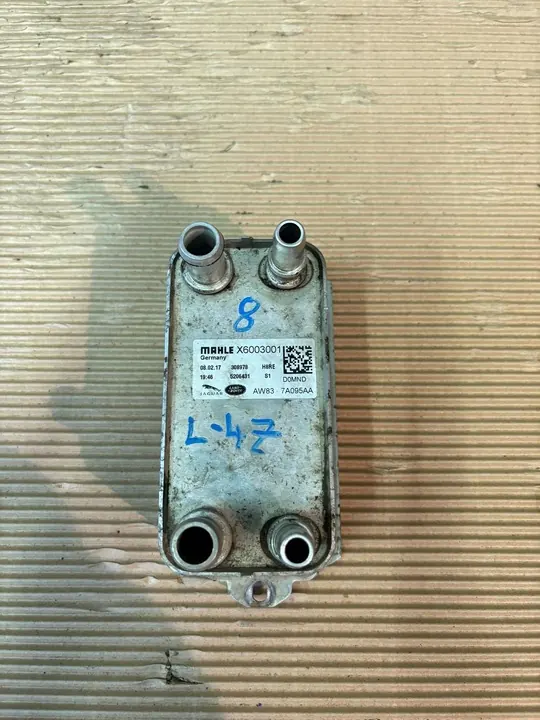 Oil cooler for Land Rover Range Rover L405 SUV 3.0 L. Manufacturer: Land Rover. Model: Range Rover L405. Body type: SUV. Engine capacity: 3.0 L. Engine power: 255 HP/190 kW. Fuel type: Diesel. Transmission type: Automatic. Engine code: 306DT. Production year: 2018. Steering: Left side. Stock number: AUI6997. Part code: AW837A095AA. OEM number: X6003001. Other numbers: 308978. Mileage: 123000 km/76428 mi. Condition: Used. Invoice: VAT invoice provided. Quality: Original with vehicle manufacturer's logo (OE). Vehicle type: 4x4/SUV. Product weight with packaging: 1 kg. Catalog number: AW83-7A095-AA. Replacement catalog numbers: 308978.