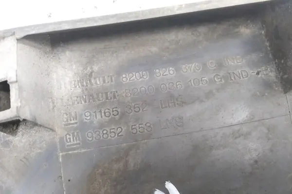 Used left side pillar cover for RENAULT TRAFIC II. This part is an original equipment (OE) component with the OEM number 8200326370G. It is suitable for passenger cars and comes with a VAT invoice. The part is in good condition and features the manufacturer's logo.