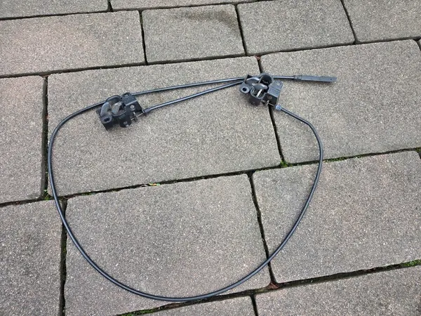 Set of 2 hood locks and cables for Mercedes R-KLASA W251, original parts. OEM numbers A2198800060 and A2518800059. Suitable for models from 2005 to 2014. Used condition, includes VAT invoice. Real photos provided.