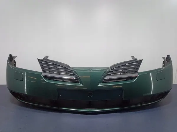 This listing is for a front bumper for the Nissan Primera P12, OEM number 62022-AU340, color code DV9. The bumper includes fog lights (8200002469, 8200002470), a grille, and a washer hose for the headlights. The headlight washers are included (28655-AU300, 28654-AU300) but have a damaged hose attachment. All other attachments are intact. There are visible signs of previous repairs, scratches, and scuffs as shown in the photos. The item is classified as quality B.
