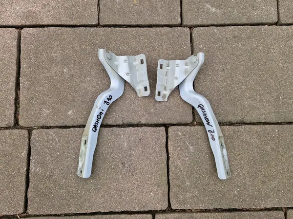 Complete set of original hood hinges for Nissan Qashqai I J10, models 2006 - 2013. Condition: very good. Demounted from a European version. Purchase includes the item shown in the real photo.