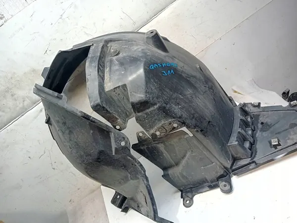 Front left wheel arch for Nissan Qashqai J11, model years 2013-2017. Part number: 63843-4EA0A. This is a used part in good condition. It is suitable for passenger cars and features the original manufacturer's logo (OEM). The part is from a European version of the vehicle.
