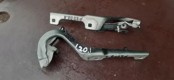 Hood hinges set for PEUGEOT 2008 I, including left and right hinges. OEM part numbers are 9678398480 and 9678389580. The part is used and comes with VAT invoice. It is an original part with the vehicle manufacturer's logo (OE), suitable for passenger cars. The installation side is front, and it is a European version. The product weight is 2 kg.