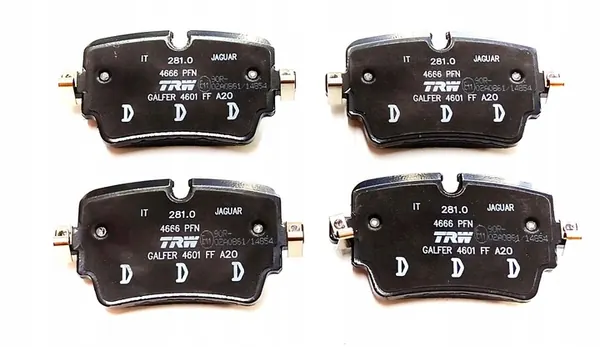 Rear brake pads for Jaguar F-Type (X152) models, suitable for various engine specifications including 2.0 i4 (300 HP), 3.0 (340 HP), 3.0 S (380 HP), and 5.0 SVR (575 HP). This part is in used condition and is an original Jaguar OE component. The part number is T2R12793. The sale includes a complete set, but does not come with original packaging. The actual condition of the item is shown in the provided images. Further information is available upon request.