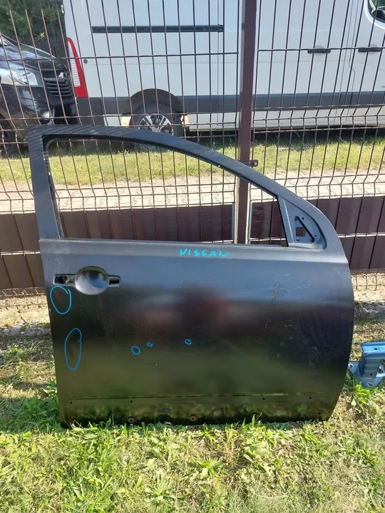 Right front door for Nissan Qashqai J10, model years 2008-2013. Condition as shown in photos. Original part with damage from transport. Repair needed on the mirror area and marked spots.