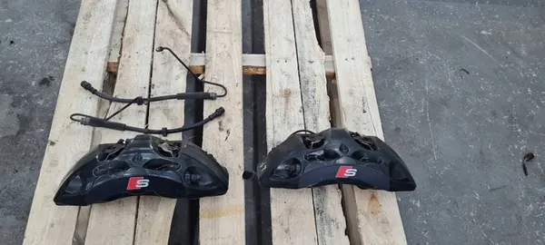 Front brake calipers for Audi A5 and S5, suitable for models from 2016 with a 3.0 L gasoline engine (CWG, CWGD) producing 349 HP (260 kW). Vehicle production year: 2018. Paint code: LY9C. Mileage: 55614 km.