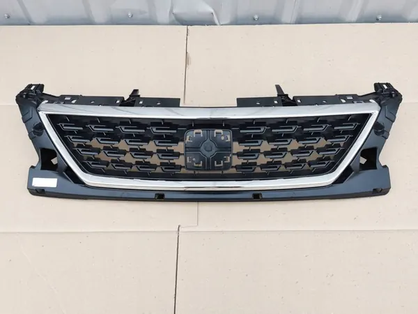 Front grill for SEAT LEON III 5F0 LIFT 17, in very good condition. Original part with factory number 5F0853654H-BAX and OEM number 5F0853654H. This is a used automotive part. Any damages or repairs are noted and visible in the photos. The photos represent the actual condition of the item.