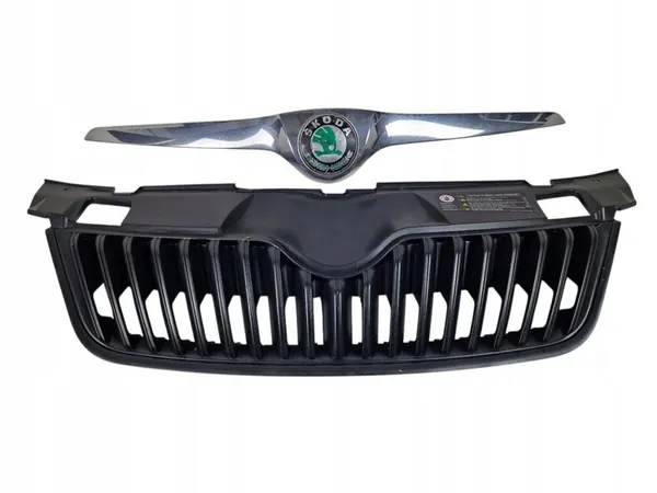Original complete chrome front grille for SKODA FABIA 2. The grille is in good condition with all mounting points intact. This is an original part from a dismantling in Germany. The part is used and suitable for passenger cars. The color is black, and it is designed for the front side of the vehicle. OEM number is 5J0853668B.