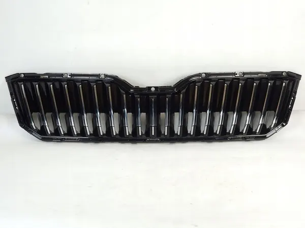 Used SKODA SUPERB 3 grill, part number 3V0853653A, featuring a black design with chrome accents. This version does not include radar functionality. The part is in very good condition, resembling new. OEM quality from Skoda, with VAT invoice available.