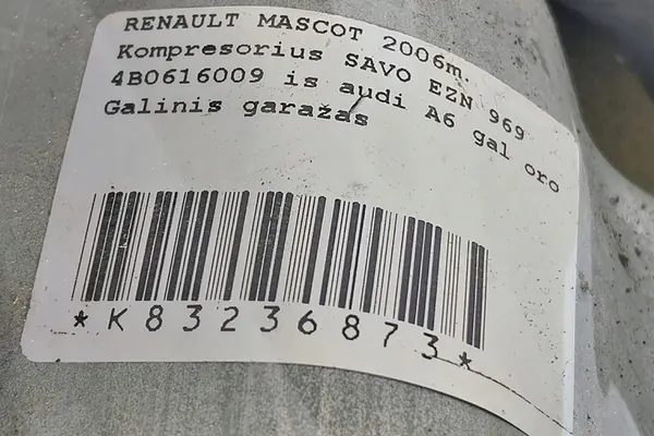 Used suspension compressor for AUDI A6 AVANT (4B5, C5) with a 2.5L diesel engine and 110kW power. OEM part number is 4B0616009A. This part is original with the manufacturer's logo (OE) and comes with a VAT invoice.