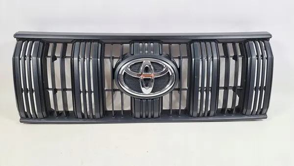 Used front grill for TOYOTA LAND CRUISER J150. Part number: 53101-60E70 / 53111-60B10. Original European version. The grill has normal signs of use, with a small scratch and a crack at the bottom, indicated by arrows.