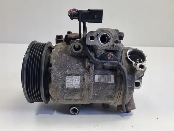 Air conditioning compressor for VW FOX 1.2 6V, produced from 2003 to 2015, engine capacity 1198cc, engine code BMD, power 40kW (55HP), part number 6Q0820808C. This is a genuine part sourced from a legal vehicle dismantling. The compressor is in the same condition as it was removed from the vehicle. It may show natural signs of use or storage. The compressor has a slightly damaged wheel, as shown in the photos, but is otherwise in good condition.