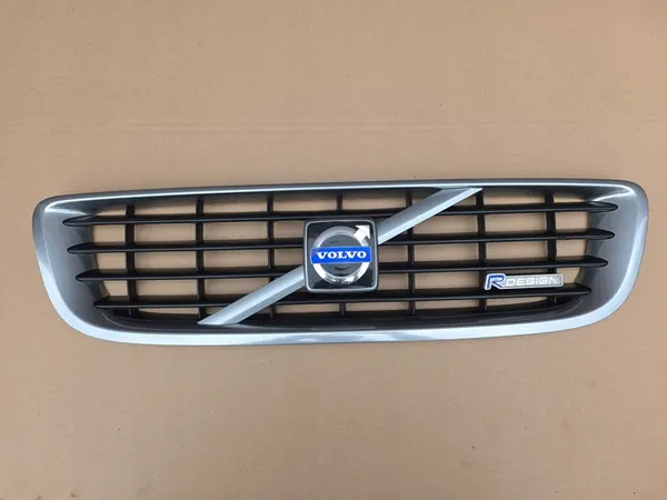 Original front grille for Volvo S40 II and V50 R-Design. Condition as shown in the pictures. One clip is missing (indicated by an arrow), and there is a slight defect in one of the grille ribs.