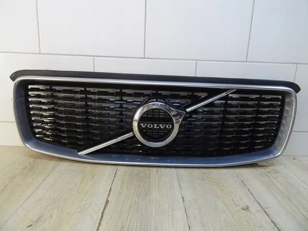 Used VOLVO XC90 II 15-19 R-DESIGN front grill, OEM 31408429 LLU. The grill base is original, but it is missing one vertical bar under the emblem. The chrome is damaged, but all mounting brackets are included. The paint code for the part is unknown. Please verify compatibility with your vehicle before purchase.