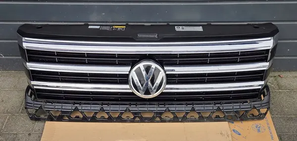 Front bumper grill for VW CRAFTER II, OEM part numbers 7C0853653 and 7C0853651A. The grill is in excellent condition, not glued or repaired. There is a small crack in the frame located in an inconspicuous area, which can be repaired at no additional cost. This item is available for viewing at position 111 at the Poznań market.