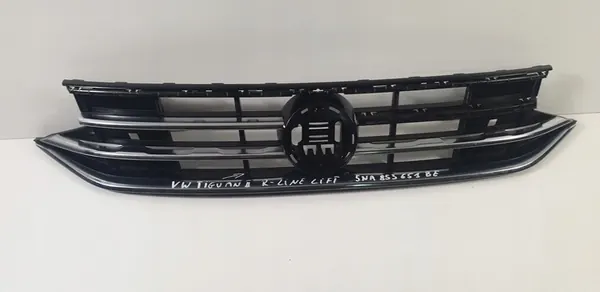 Item for sale: Front grill for VW TIGUAN II LIFT R-LINE. OEM part number: 5NA853651BE. This is a used item with a slight visible damage. The part is original and comes in black.