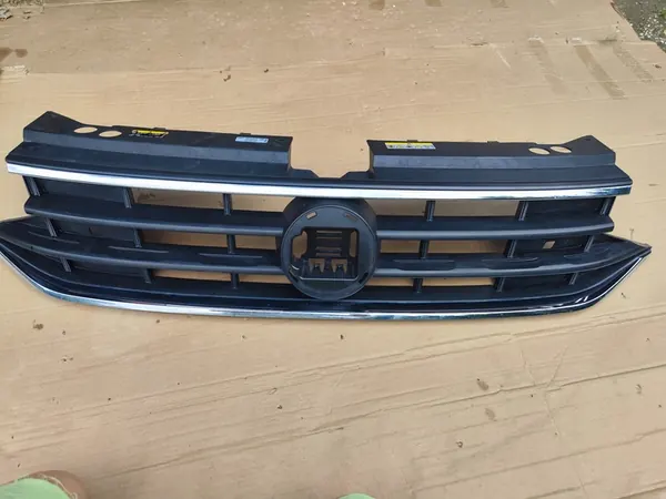 Front grill for VW Tiguan II 5NA Lift 20, OEM part number 5NA853651BE. The part is used and has a damaged mounting. It is an original part from Volkswagen with the manufacturer's logo. The part is suitable for the European version of the vehicle.