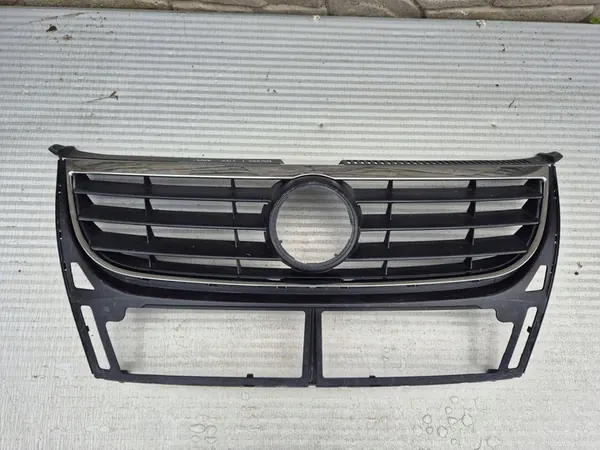 Used front grill bumper for VW TOURAN I LIFT 06-. OEM part number 1T0853651D. The item may have visible damages or repairs, as shown in the images. The photos represent the actual condition of the item.